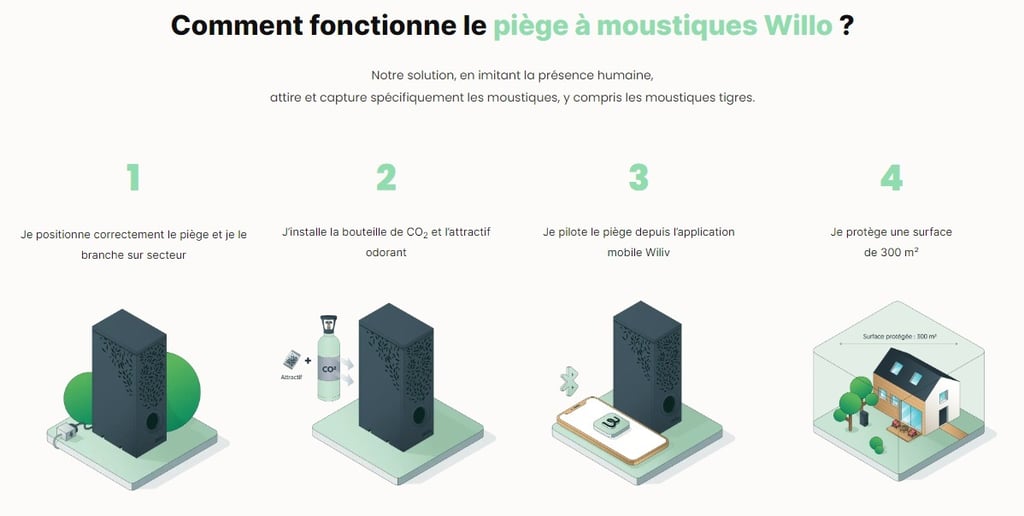 Le piège Willo développé par la marque WILIV, représente la nouvelle génération de pièges à moustiques. Grâce à une faible diffusion de CO2 et d’attractif odorant, il simule la présence humaine pour attirer efficacement les moustiques.